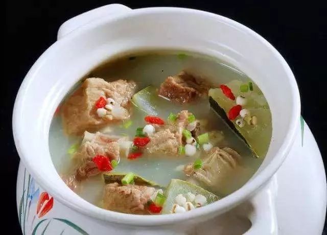 4、小火炖煮至腊排骨能用筷子轻松插穿时,把切成砣的冬瓜倒入炀锅中,留下几小块冬瓜皮洗净也一同放入,大火烧开后,依然改用小火炖煮,炖煮至冬瓜也同样能用筷子插穿时,关火,移入大碗中上桌享用。